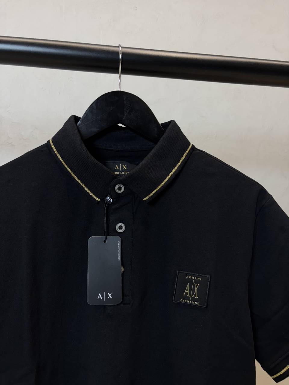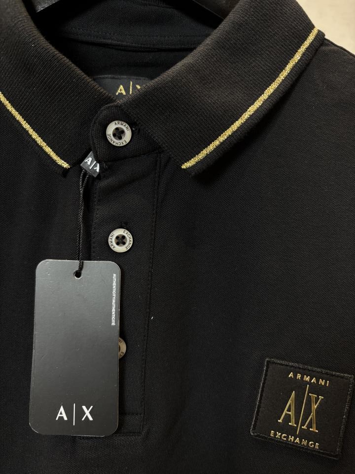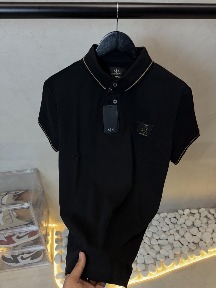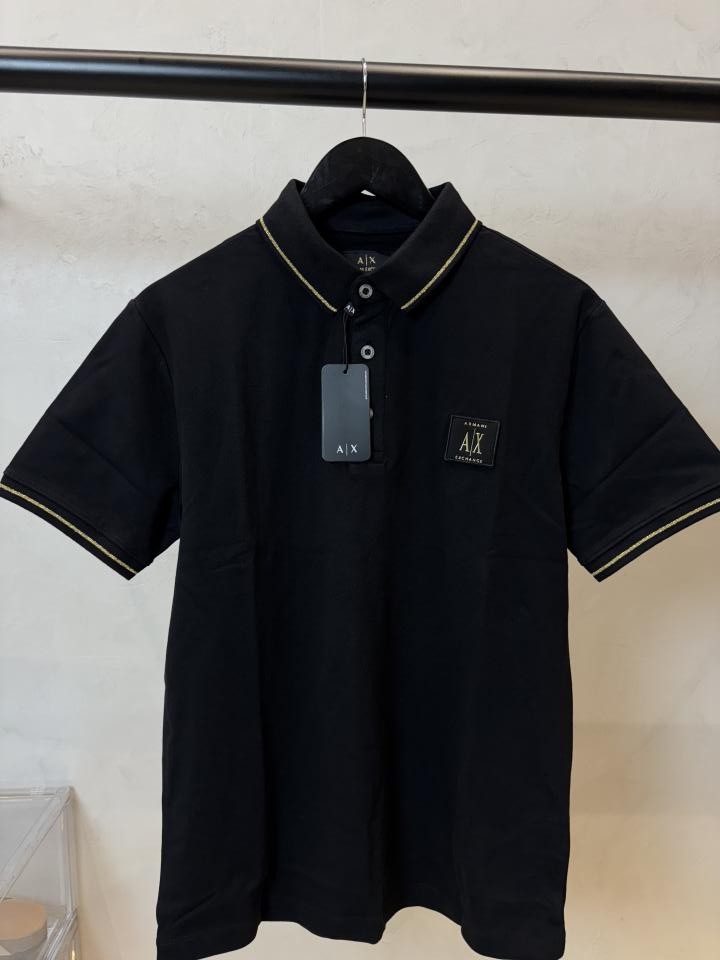 A timeless black polo elevated with subtle gold tipping on the collar and sleeves. Crafted in soft, breathable cotton with a structured fit, finished with the signature AX chest patch for a refined everyday look.
